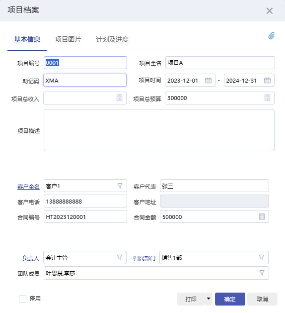企业在项目成立之际,一般需要事先进行可行性分析,报告审批后再进行立项。此时,项目管理人员可以在系统中建立项目档案。如下图: